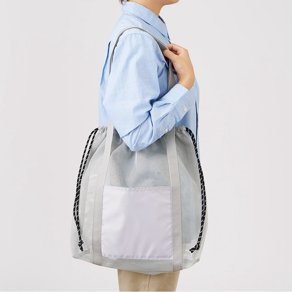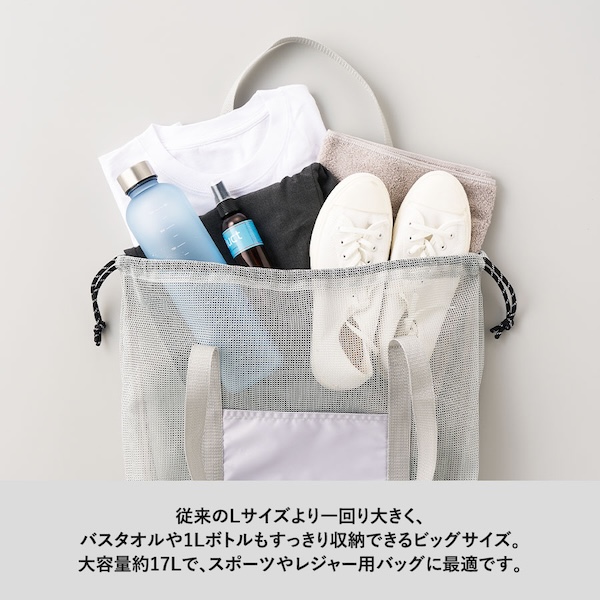 M・L・LLの3サイズ展開で、LLサイズは大判のバスタオルや1Lボトルなど大きめのものも