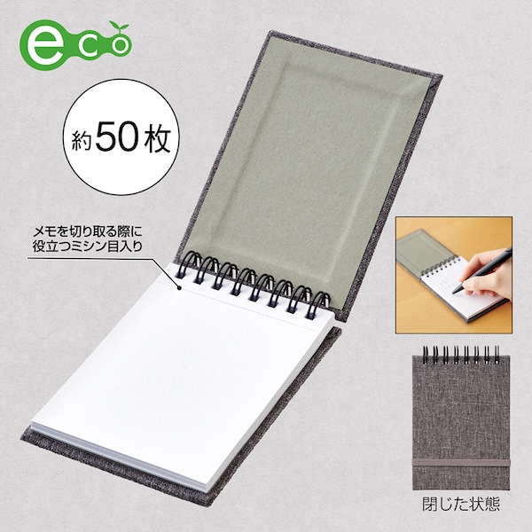 表紙はリサイクルPET生地を使用、メモ用紙は再生紙!環境に配慮したエコメモ帳。