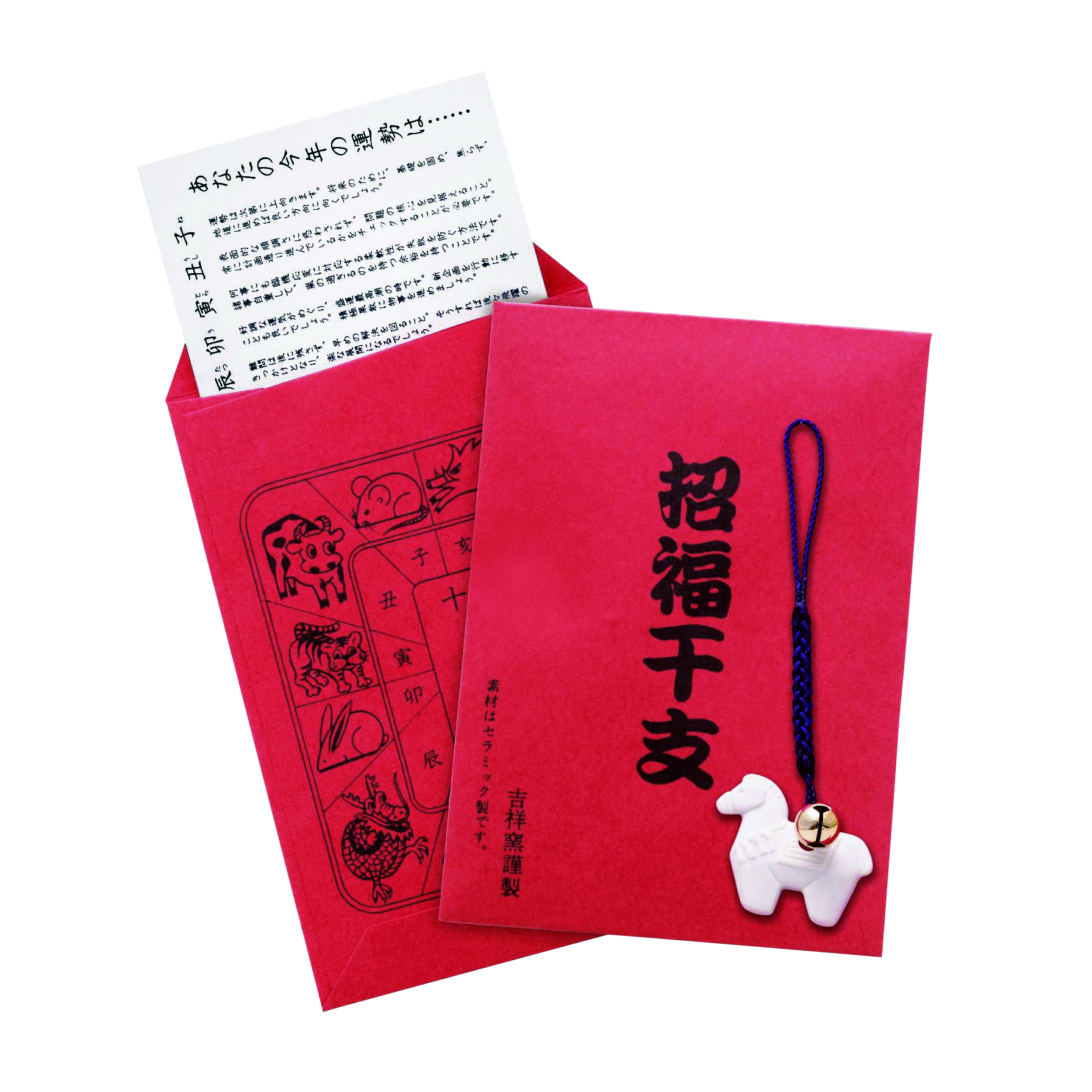 化粧袋の中には幸運の干支ねつけ、さらに運勢表入り。手軽にお渡しできるので、年末年始のノベルティに最適です。