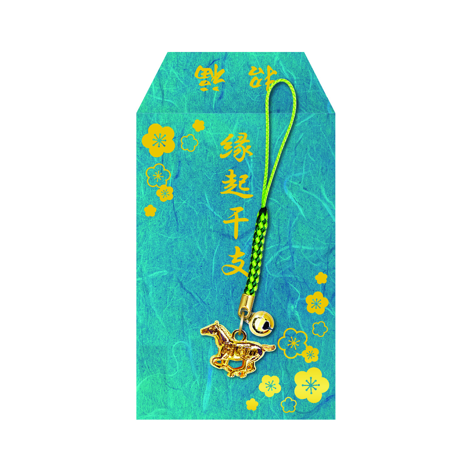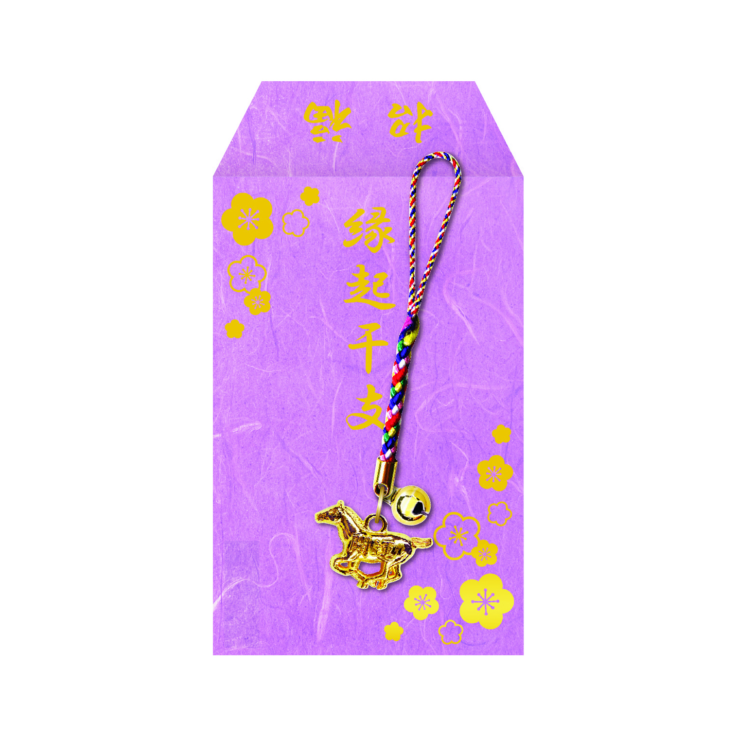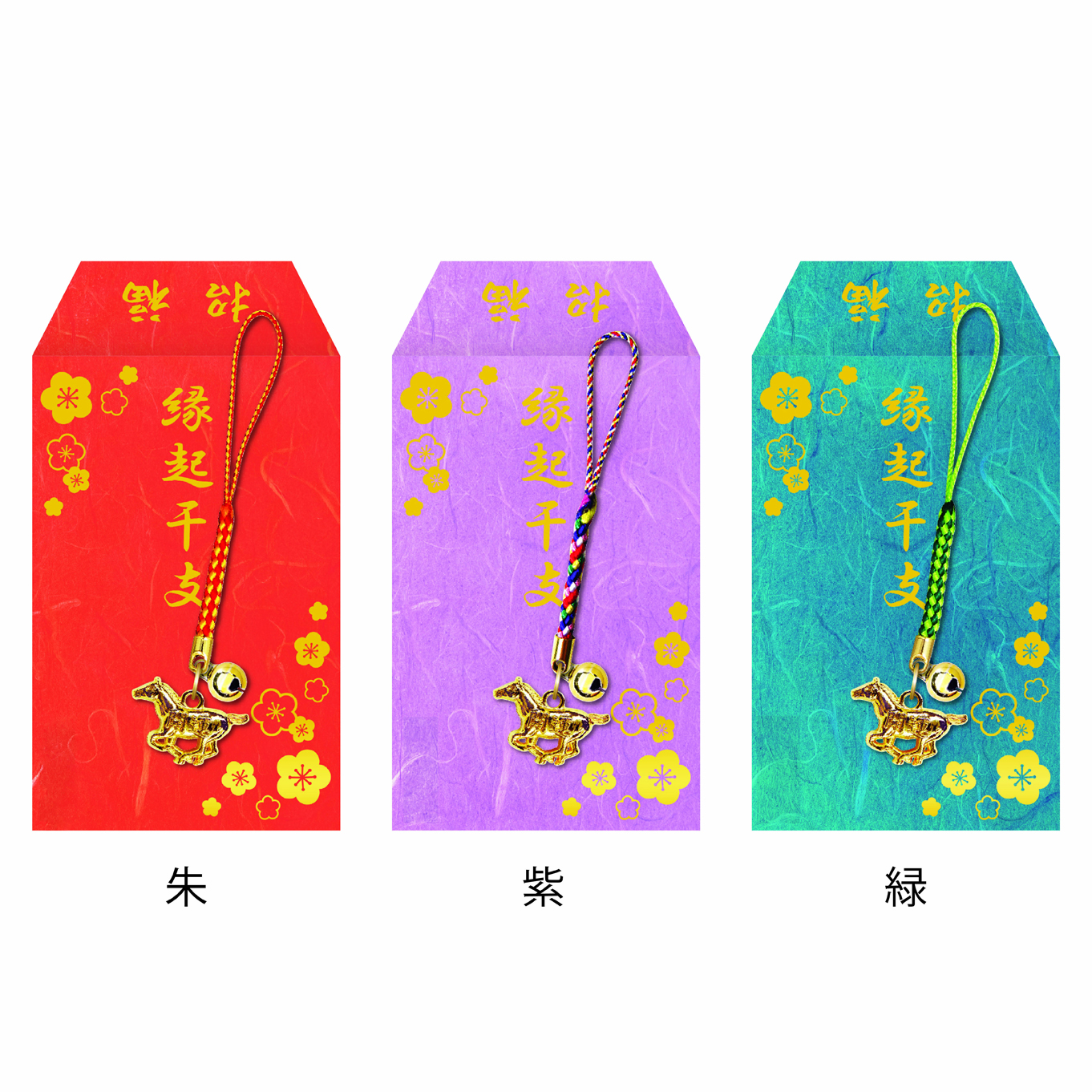 鮮やかな色付き袋入りの干支ねつけ。袋の文字や柄は箔押しなので、めでたさや縁起の良さを演出します。