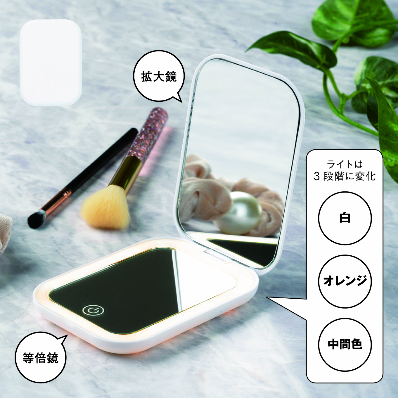 等倍鏡、拡大鏡がセットになった手の平サイズのミラー。電源をタップするだけでライトが操作できる機能派です。