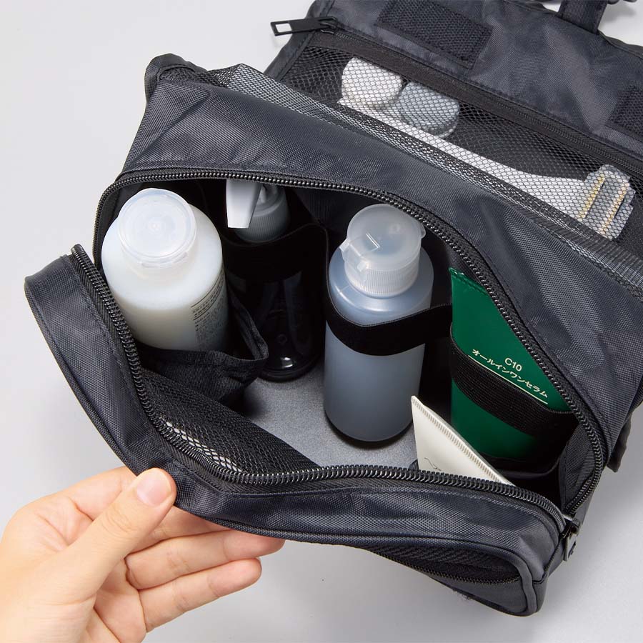 上部はメッシュポケットが2つ、下部はメッシュポーチに分れており、用途別に仕分けが可能です。