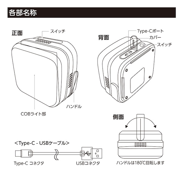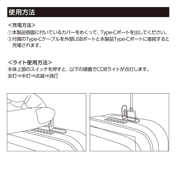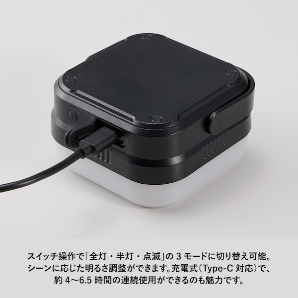 スイッチの操作回数で、「全灯・半灯・点滅」の3モードに切り替えが可能です。