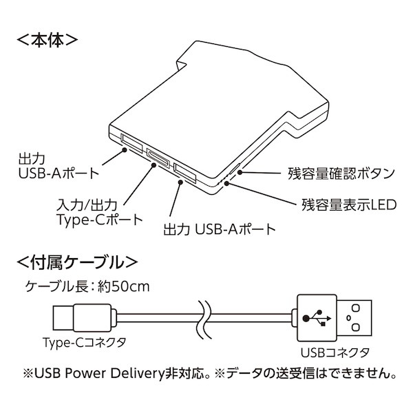 | 備考 | 取説付、最大出力2.4A、バッテリー容量5000mAh、本体重量約123g、Type-Cケーブル付属、残量表示ランプ付 |