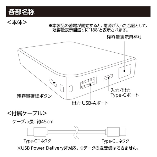 | 備考 | 取説付、最大出力2A、バッテリー容量8000mAh、本体重量約165g、Type-C-USBケーブル付属 |