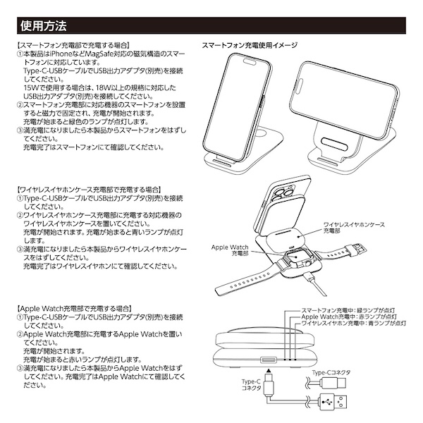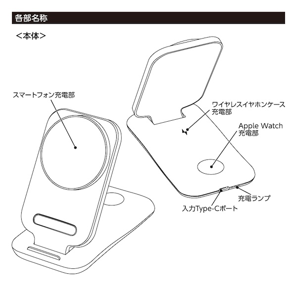 ※充電可能箇所はスマートフォン充電部、ワイヤレスイヤホン充電部、Apple Watch充電部の3ヶ所です。
