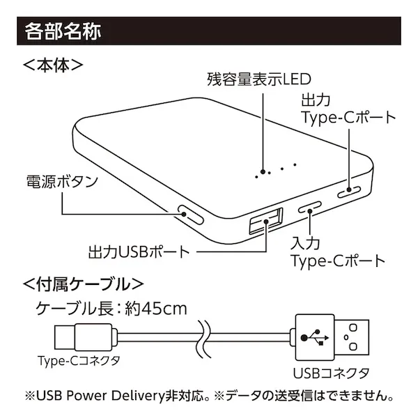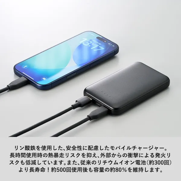 リン酸鉄を使用した、発火リスクの少ないモバイルチャージャーです。