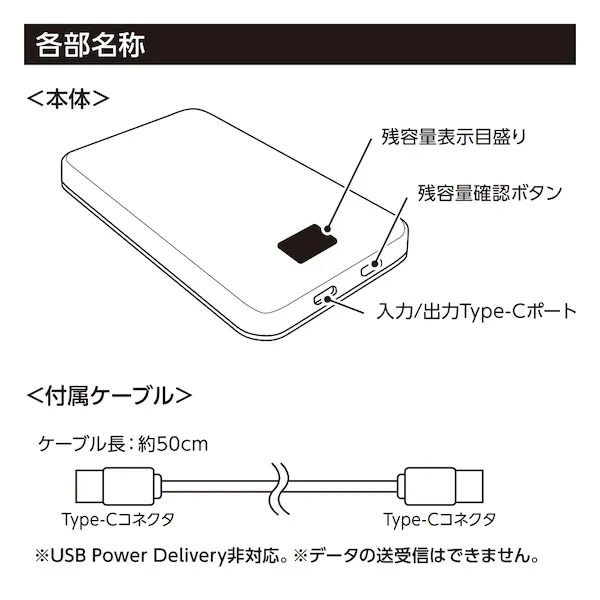 | 備考 | 取説付、最大出力2A、バッテリー容量5000mAh、本体重量約122g、Type-C-USBケーブル付属 |