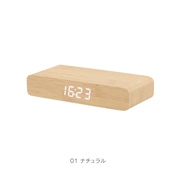 ワイヤレス充電機能の付いた、スリムな木製LEDクロック。