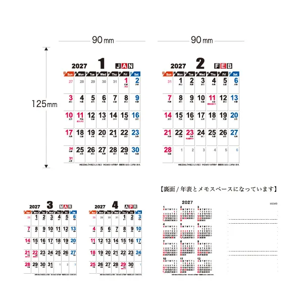 2カ月分を一度に見ることができるため、スケジュール管理に大変便利です。裏面には年間カレンダー、メモが入っていて、一目でわかる年表が台紙に入っています。