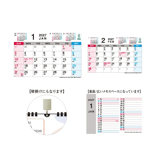 大きな文字で見やすく、裏面にはスケジュール管理に便利な広いメモスペースが付いています。