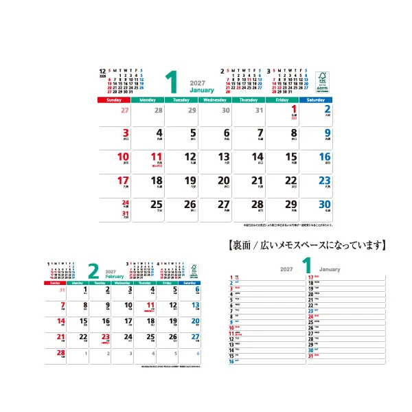 シンプルなデザインでメモ書きもしやすく、裏面にはスケジュール管理に便利な広いメモスペースがあります。環境に優しいペーパーリング仕様のカレンダーです。翌年の1月まで入っています。一目で分かる年表が台紙に入っています。