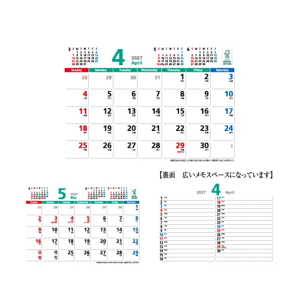 4月から始まって翌年の3月まで入っています。裏面には、スケジュール管理に便利な広いメモスペースが付いています。