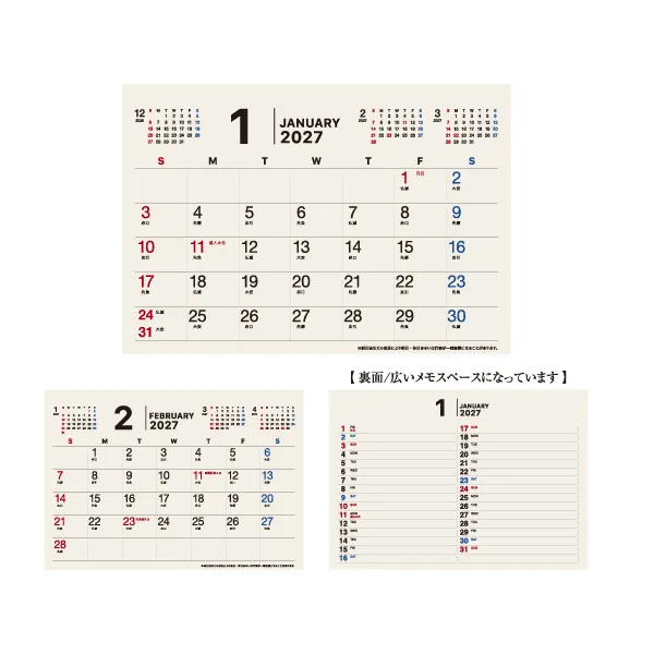 シンプルなデザインで視認性が高く、使いやすいカレンダーです。 広いメモスペースがあり、スケジュール管理がしやすい設計となっています。 落ち着いたトーンで、オフィスでも家庭でもご活用いただけます。