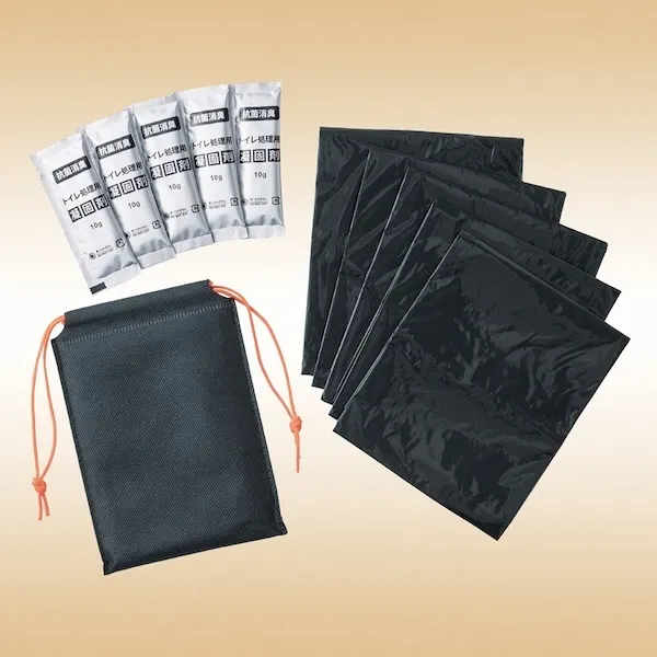 持ち運びに便利なポーチ入りの携帯トイレ5個セット。緊急時・災害時などに役立つアイテム。多機能で便利なアイテムは備えておくと安心なうえに、非常時だけでなく日常的にも役立つのが魅力。ファミリー向け、個人向けどちらのイベントにも喜ばれるノベルティです。企業や会社の販促品・ノベルティでお困りの場合、おしゃれで安いオリジナルのものをご提案します。
