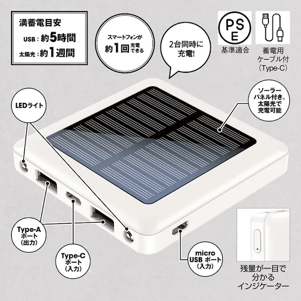 セット内容:本体、蓄電用ケーブル(Type-C) ※ソーラーパネルで満充電する場合は、約一週間必要となります。(あくまで補助機能の為、目安時間となります。使用環境により変動します。) |
