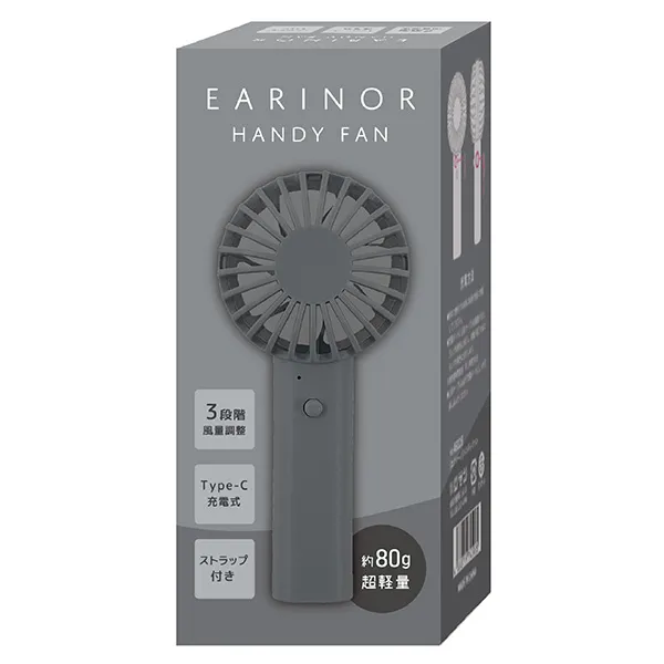 バッグに入れても気にならない大きさ。USB充電式で、風量も3段階に切り替えできる超軽量型ファンです