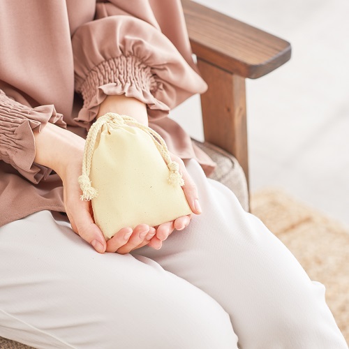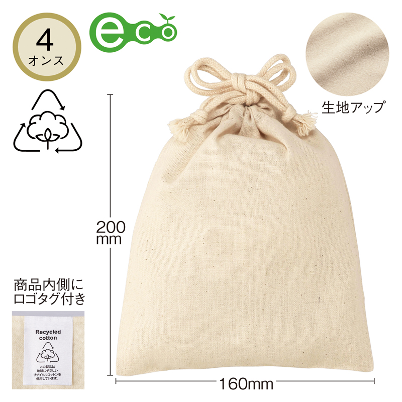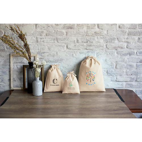 リサイクルコットンを使用した巾着タイプの小物入れです。環境に優しいエコ素材を使用しているので、SDGsへの貢献にも繋がります。サイズもS,M,Lとありますので、シーンに合わせてお選び頂けます。大きく名入れが可能なので、オリジナル性の高いノベルティを作ることができます!